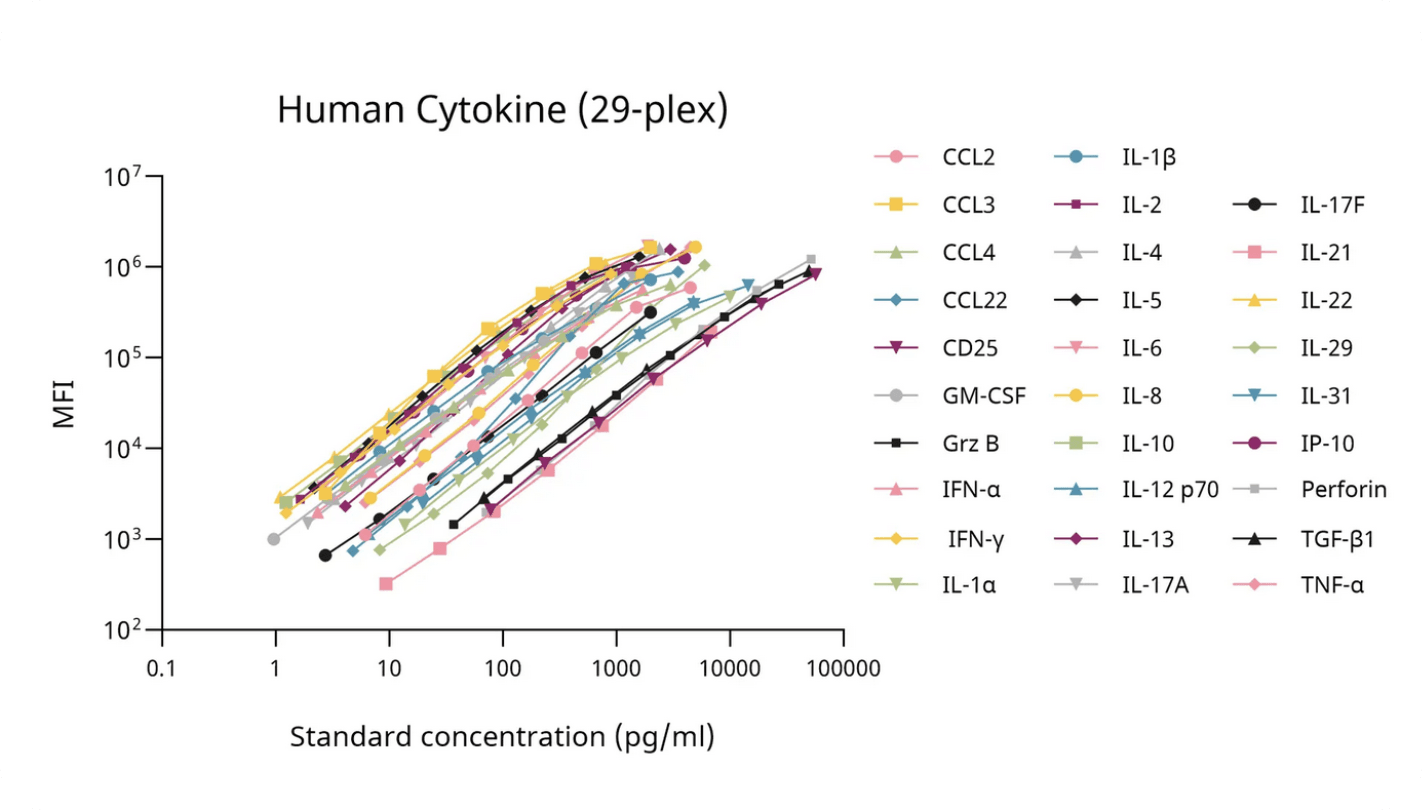 The data shown here is from our EYRAplex: Human Cytokine (29-plex) assay acquired on Mabtech EYRA™. The 7-point standard curve was generated using a 3x dilution series and fit with a five-parameter logistic (5PL) curve to determine each analyte's Limit of Detection (LOD), Lower Limit of Quantification (LLOQ), and Upper Limit of Quantification (ULOQ) as well as intra- and inter-assay CV values.