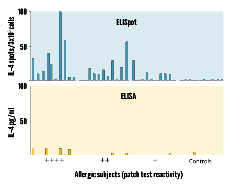 Peripheral blood mononuclear cells (PBMCs) from individuals with varying degrees of nickel allergy (+ to +++) and from non-allergic controls were stimulated with 50 µM NiCl₂ for 40 hours. IL-4 secretion was evaluated using both ELISpot and ELISA. While ELISA detected responses in only 3 allergic donors, ELISpot identified nickel-reactive IL-4–secreting cells in 23 out of 31 allergic individuals – highlighting its superior sensitivity in detecting allergen-specific T cell responses (in-house data).