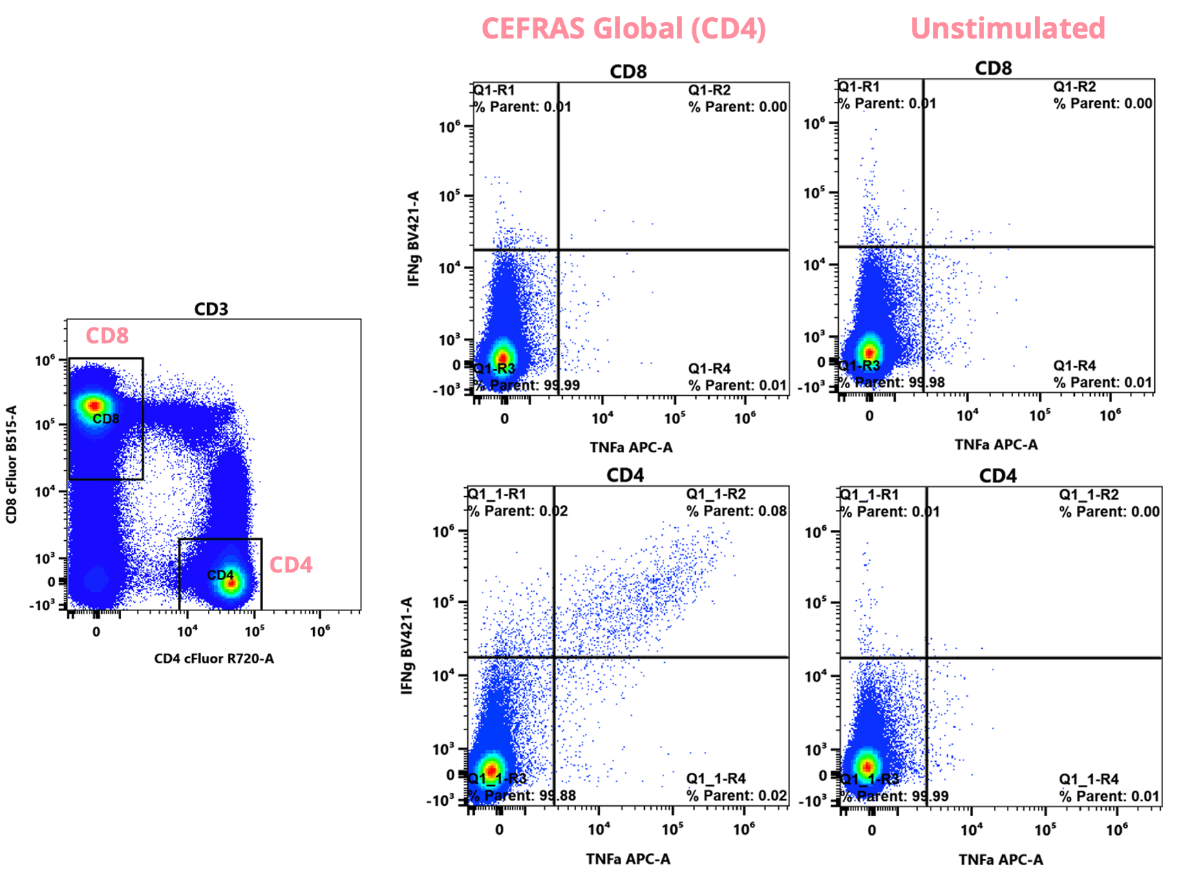 The CEFRAS Global (CD4) is also a valuable positive control in flow cytometry experiments. In this intracellular cytokine staining experiment, we stimulated PBMCs with the peptide pool and stained for several surface markers and intracellular cytokine production. We found consistent increases in the production of these target cytokines following stimulation with the CEFRAS Global (CD4) pool, adding to the multiple uses of the positive control stimuli in your T helper cell-related flow cytometry experiments.