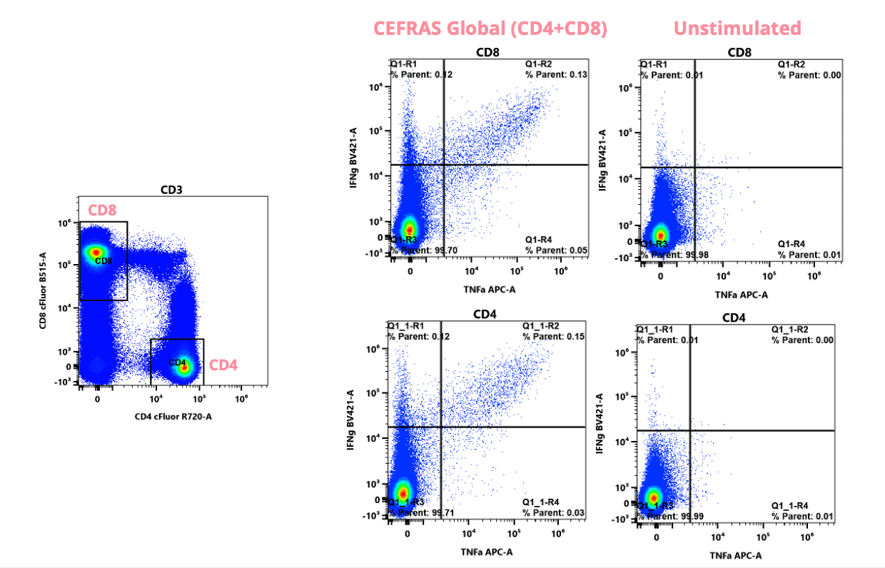 The CEFRAS Global (CD4 and CD8) is another broad positive control peptide pool useful in flow cytometry experiments when you want to look at both CD8- and CD4-specific responses simultaneously. In this intracellular cytokine staining experiment, we stimulated PBMCs with the peptide pool and stained for several similar surface markers as previously, as well as for intracellular cytokine production. We found consistent increases in the production of these target cytokines following stimulation with the CEFRAS Global (CD4 and CD8) pool, allowing one to assess both CD4 and CD8 T cell responses at the same time.
