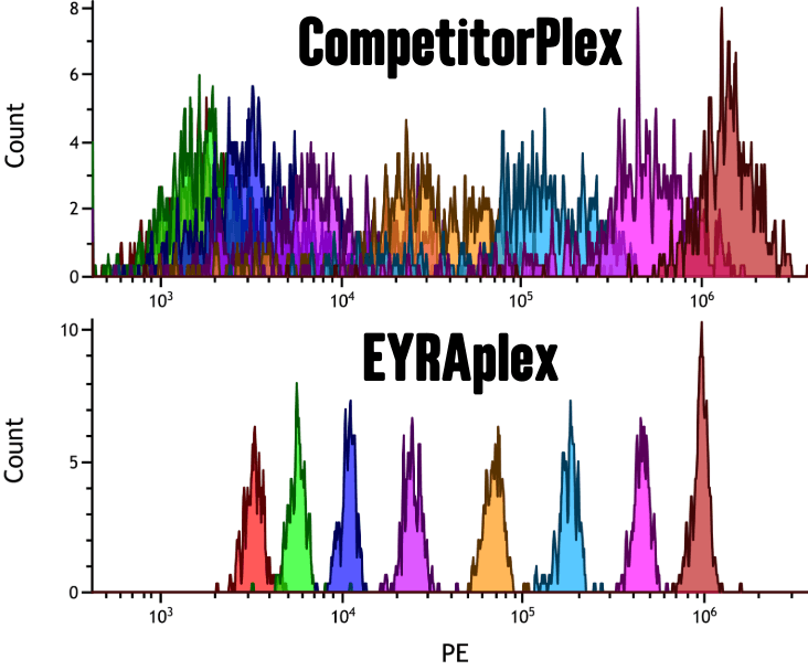 PE fluorescent signal peaks from each dilution step of CompetitorPlex's and EYRAplex's standard curves. The median fluorescent intensity of the PE peak determines both the standard curve and the concentration of your unknown samples.