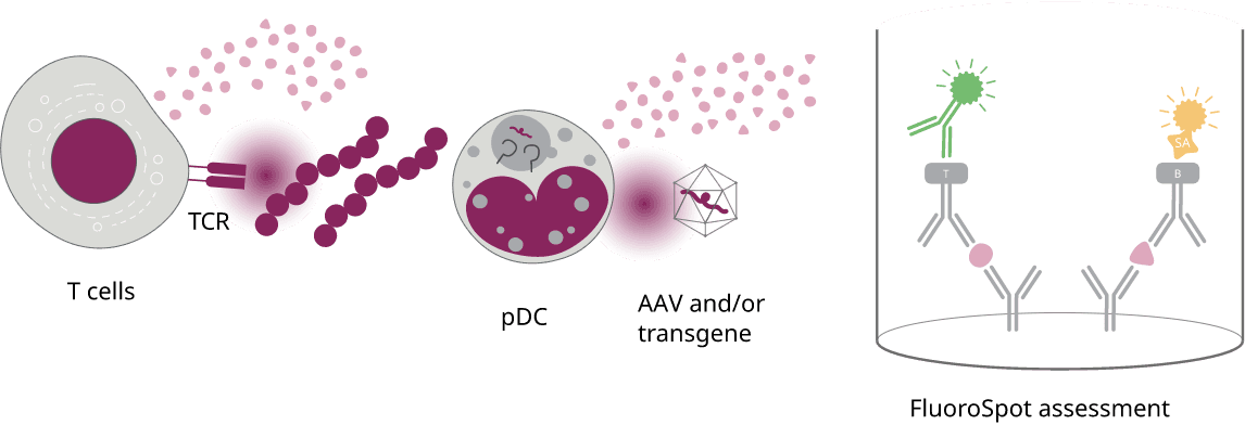 FluoroSpot is the multiplex version of ELISpot. Just like in ELISpot, target proteins secreted by cells are captured by specific antibodies immediately after secretion and throughout the stimulation, making it an extremely sensitive sandwich assay. The difference to ELISpot lies in the mode of detection: where ELISpot relies on an enzymatic reaction, FluoroSpot utilizes fluorescence.