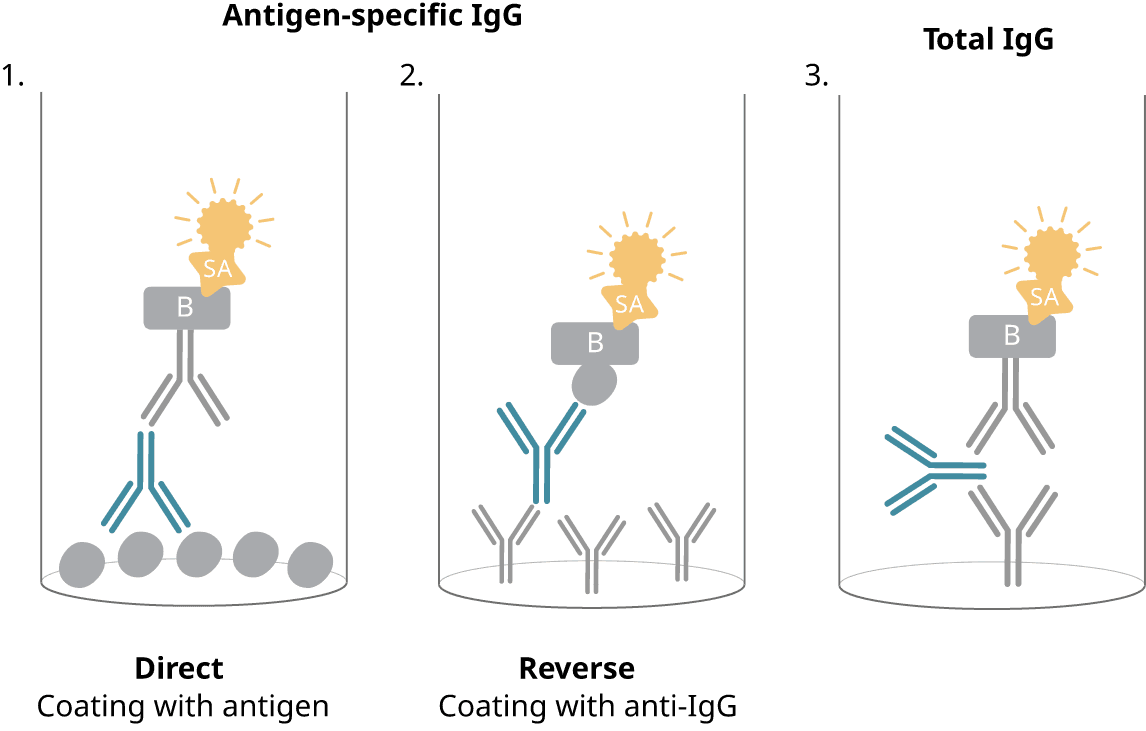 The B cell FluoroSpot assay is one of few assays that can measure immunoglobulins directly upon secretion. One can assess multiple total immunoglobulin secretion by antibody-secreting cells (ASCs) or memory B cells, as well as multiple antigen-specific B cell responses from both cell types, using the antigens of interest as a capture or detection reagent.