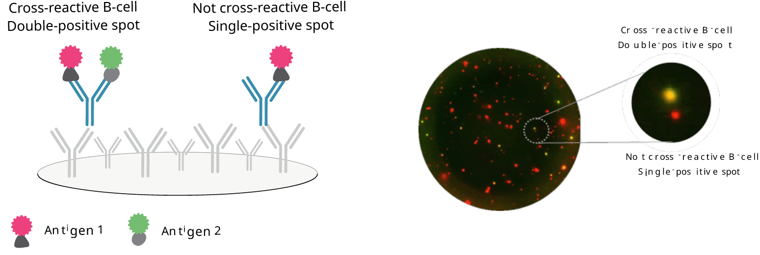 B cell FluoroSpot can be used to answer several research questions in infection and vaccine research. One can assess multiple immunoglobulin isotypes, subclasses, and even antigens! By using reverse B cell FluoroSpot, multiple antigens can be used to detect single and cross-reactive B cells. This adds new, added layers to your B cell research and can help guide new vaccine development and assessment.