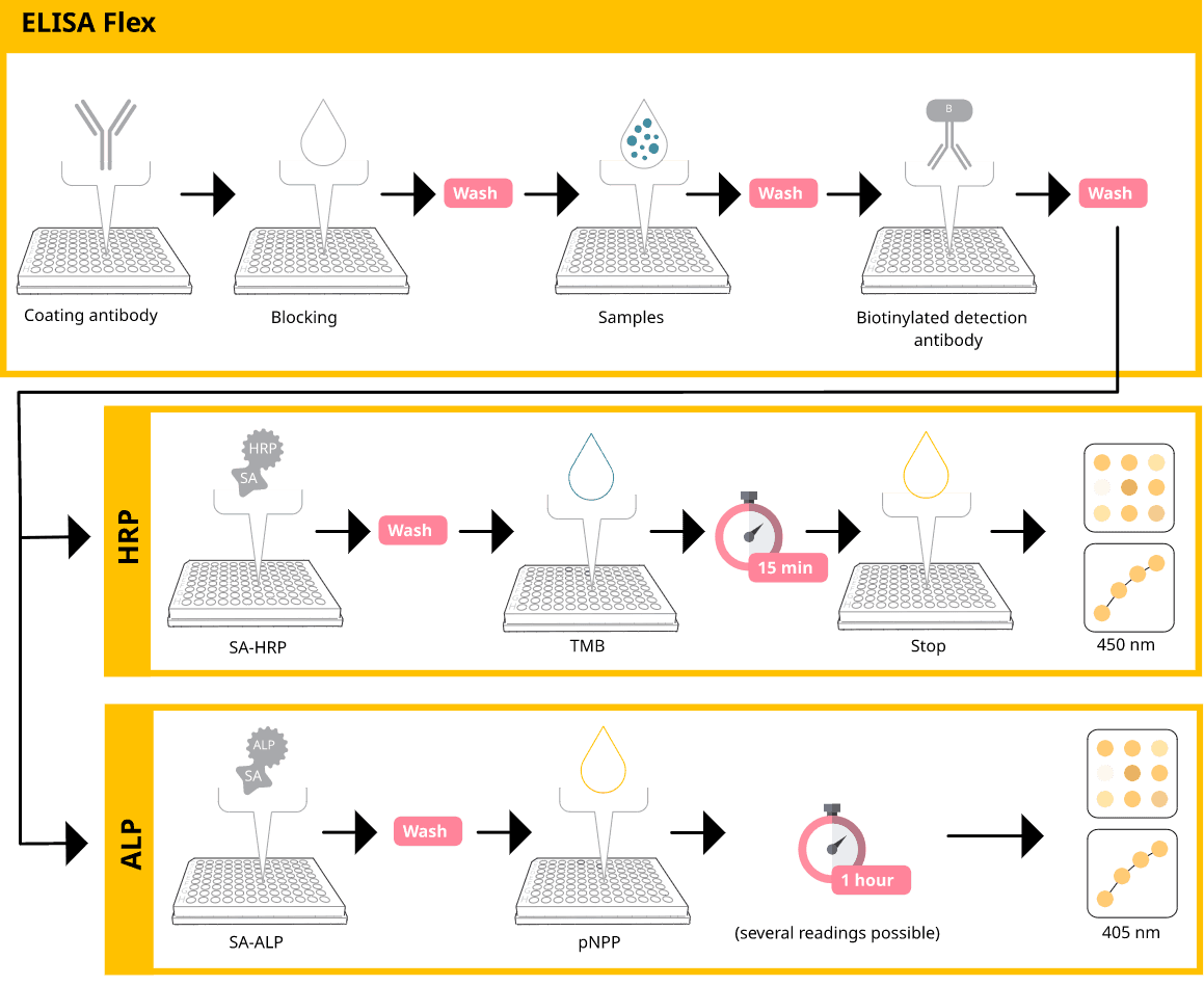 Tip! HRP+TMB reaction is stopped and then read, whereas ALP+pNPP allows for readings at different time points.