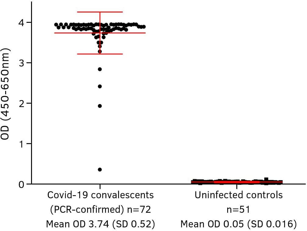 This ELISA assay employs a bridging technology for detection of antibodies (immunoglobulins IgG, IgA, IgM) to the SARS-CoV-2 Receptor Binding Domain (RBD) in solutions, e.g., serum/plasma. The kit contains all reagents and buffers needed for the assay. It also contains one uncoated ELISA strip-plate. The ELISA has been validated with human serum/plasma samples from COVID-19 convalescent individuals and uninfected control individuals. The ELISA is species independent. Analysis of serum/plasma samples from uninfected mouse, cynomolgus macaque, rhesus macaque, rat, cat, cow, dog, rabbit, and pig, all resulted in OD values below cut off.
